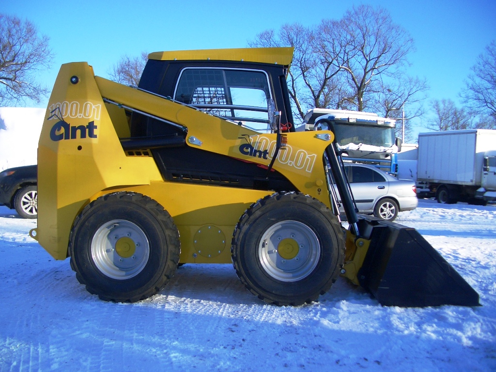 Мини-погрузчик ANT 1000 г/п 1000 кг., оснащен стрелой c высотой подъема 3362 мм, ковшом вместимостью 0,52 м3, гидроразводкой под различные гидравлическое оборудование: щетка дорожная, снегоочиститель, гидромолот, гидробур, экскаваторное оборудование, мульчерная установка, измельчитель веток, бетоносмеситель и т.д.